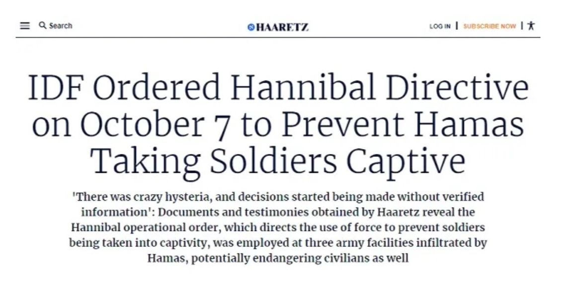 Israel Admits Killing Its Own Citizens on Oct 7th - death and destruction is always on the menu, down here on planet mental asylum. Here it appears that Israel openly admits to initiating the Hannibal Directive, which is the known and purposeful killing of its own citizens. (on Oct 7th). Oddly enough this directive was originally designed to be applied to soldiers (which is cruel enough) yet somehow it has been applied to Israeli civilians. Click here to gather more information. Which Israeli official gave that order? Were the Israeli civilians consulted, before they were killed by their own armed forces, in regards to the Hannibal Directive?