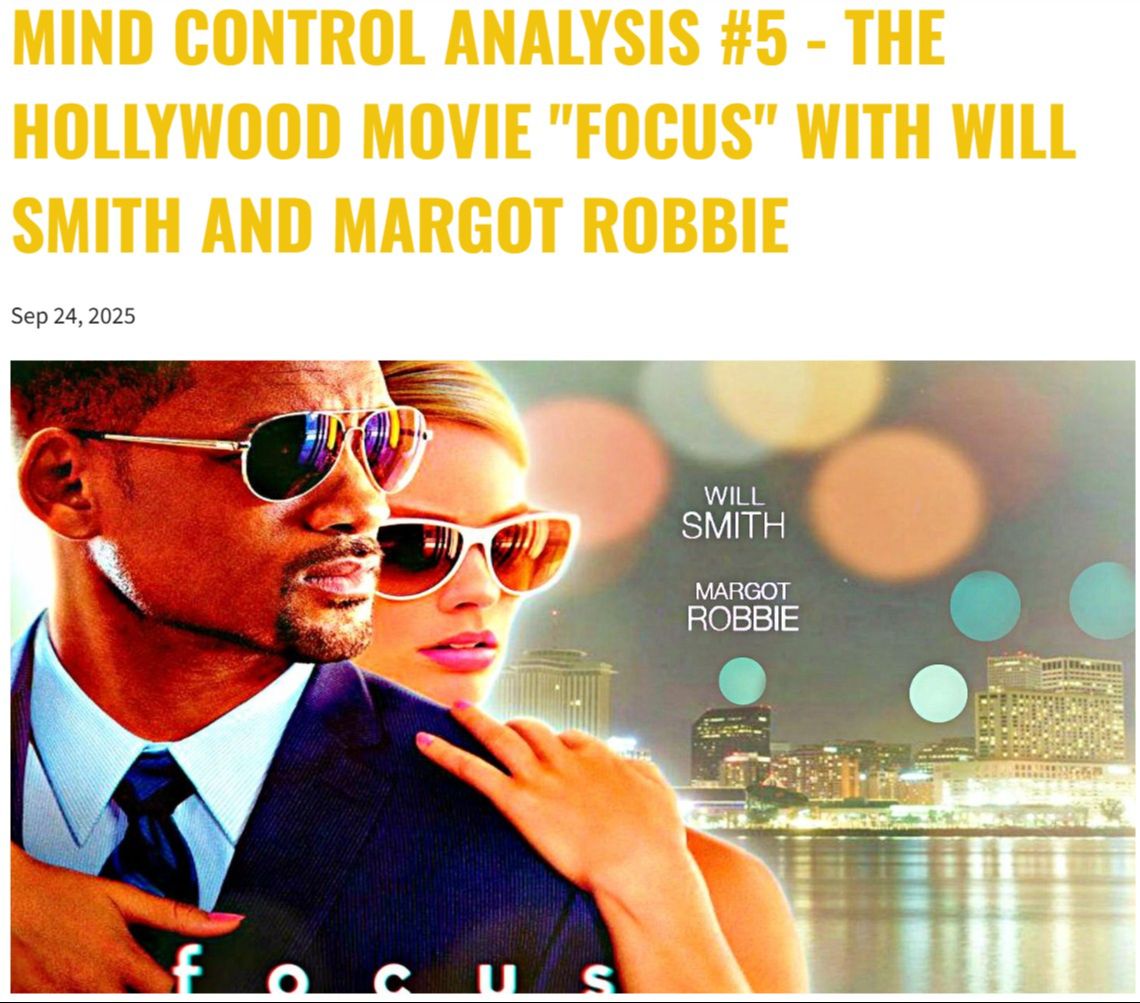 | FOCUS - Mind Control at the Movies with Will Smith and Margot Robbie - in this brilliant example of mind control, the director of the Hollywood movie FOCUS, explains clearly how mind control works. This example acts as a great way to learn about mind control, which is also very entertaining. Click here to read my quick breakdown. |